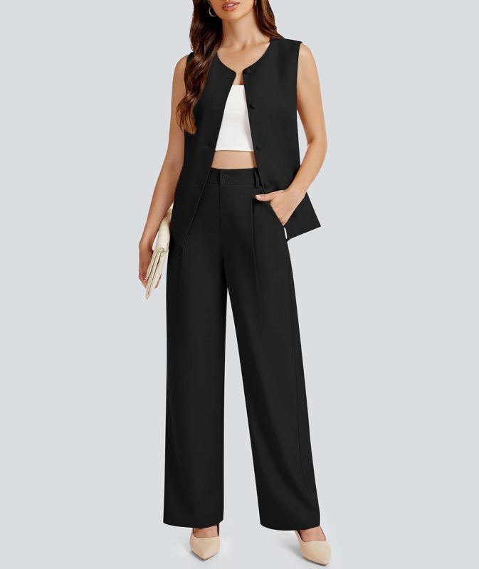Women 2 Piece Blazer Outfits Sleeveless Crewneck Vest Wide Leg Pantsuit 2026 Dressy Casual Work Sets