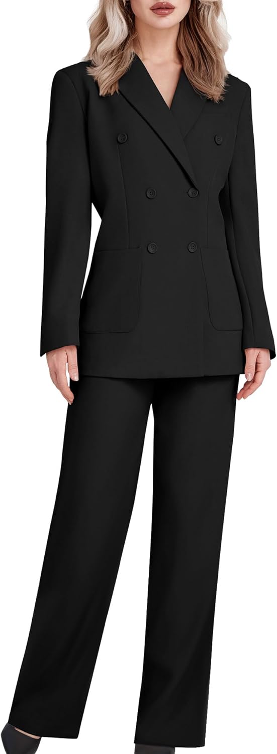 - STYLE: This Women suit features a solid colour blazer with double-breasted buttons, notched lapels, single back slit, breast pocket and two flap pockets. The matching trousers are designed with a straight front, zipper placket with button closure, elasticated side waist, and two front slash pockets.