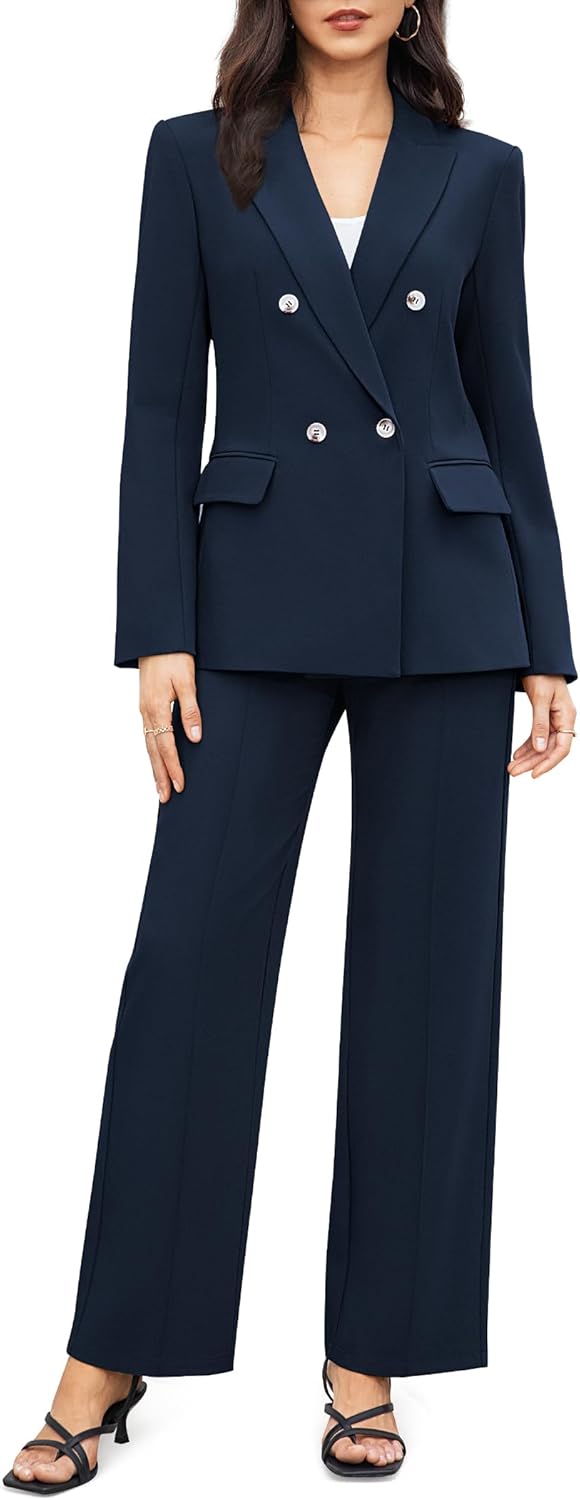 - Design: Our dressy casual outfits for women feature a peaked collar, double-breasted front, 4-button cuffs, and back slit hem. This blazer set exudes modern refinement. Wide leg pants with a back elastic waistband offer structure and stretch